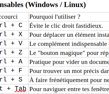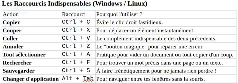 Voici un tableau récapitulatif des raccourcis essentiels pour booster ta productivité. Ce sont les "accélérateurs" dont je parlais dans l'article :