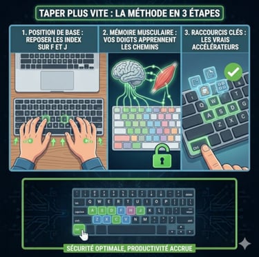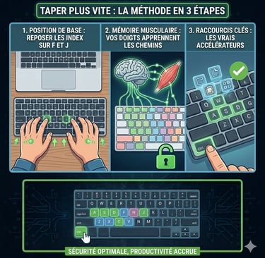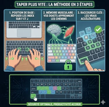 Avez-vous déjà compté le temps que vous passez à taper chaque jour ? E-mails, rapports, messages... Pour beaucoup d'entre nous, le clavier est notre outil de travail principal. Et pourtant, la plupart des gens se contentent de la méthode du 'cherche et tape' avec deux doigts, perdant des heures précieuses en erreurs et en lenteur. Imaginez : doubler votre vitesse de frappe, c'est comme gagner des jours entiers de temps libre chaque année. Ce n'est pas un talent inné, c'est une technique. Découvrez comment transformer vos mains en outils de précision.