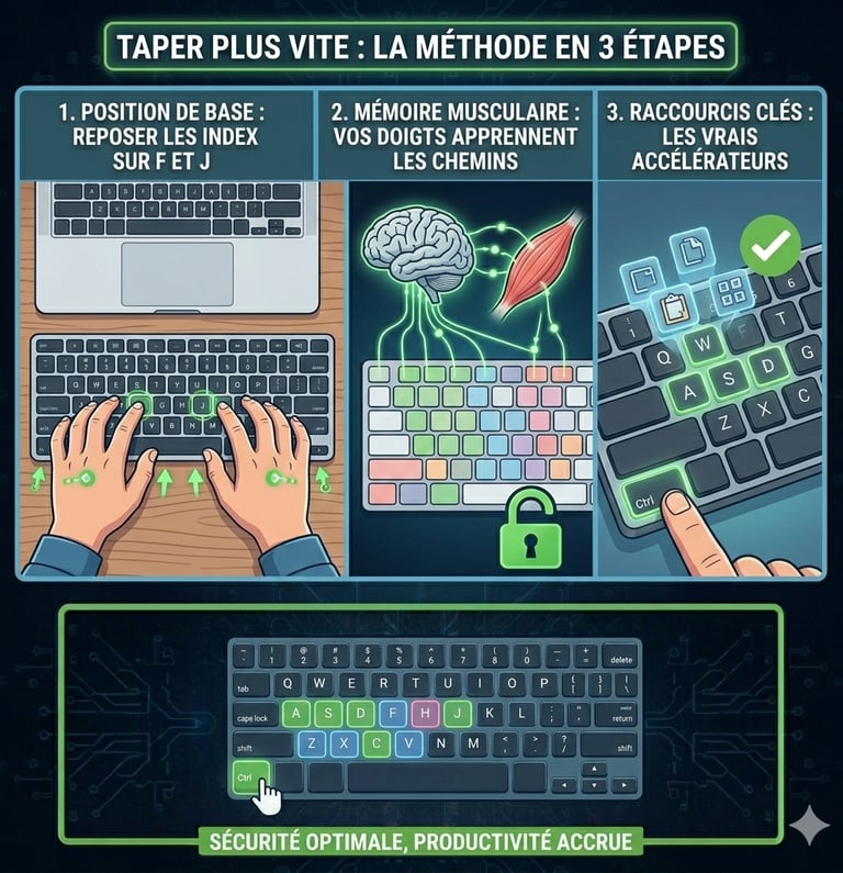Apprenez les raccourcis essentiels : Taper vite, c'est bien. Mais taper vite tout en gérant le système, c'est mieux. Maîtrisez Ctrl+C (Copier), Ctrl+V (Coller), Ctrl+Z (Annuler), Ctrl+A (Tout sélectionner), Ctrl+T (Nouvel onglet), et Alt+Tab (Changer de fenêtre). Ce sont de vrais accélérateurs de productivité.
