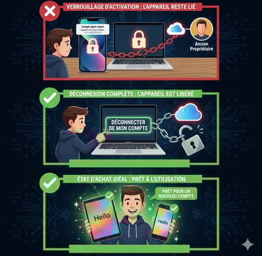 Côté Vendeur : Suivez la procédure officielle d'Apple ("Que faire avant de vendre..."). Effacer le contenu ne suffit pas, il faut détacher le lien matériel.