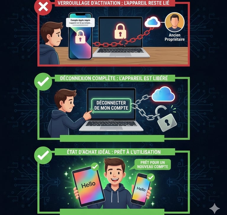 "Vous venez de dénicher le MacBook ou l'iPhone de vos rêves sur une plateforme de seconde main. Le prix est imbattable, l'état est nickel. Vous l'allumez, le cœur battant... et là, l'écran vous demande l'identifiant Apple de l'ancien propriétaire. Sans ce mot de passe, votre nouvel achat est totalement inutilisable. C’est le piège du verrouillage d’activation : si le vendeur n'a pas fait le ménage, vous avez acheté un objet de décoration très coûteux. Voici comment éviter le cauchemar."
